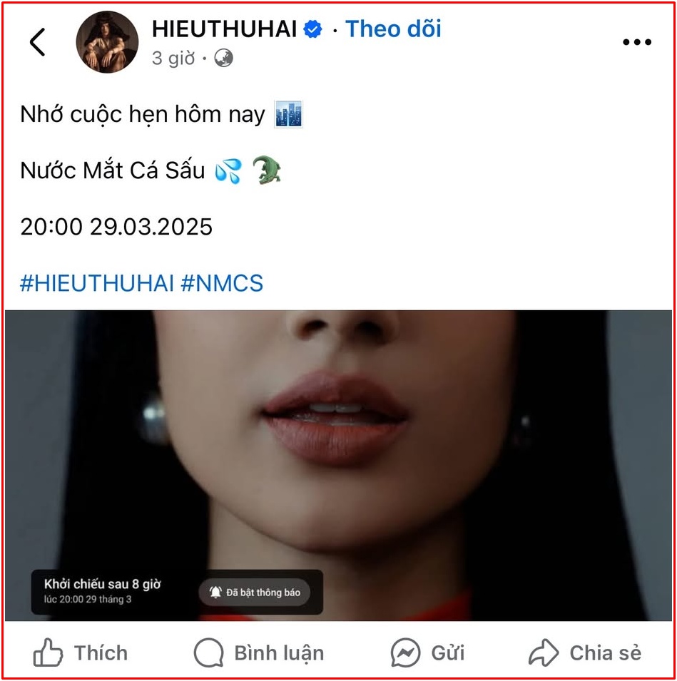 HIEUTHUHAI chính thức ra mắt sản phẩm âm nhạc mới, được anh thông báo bằng một câu ngắn gọn trên fanpage: "Nhớ cuộc hẹn hôm nay. 20h, 29/3/2025".