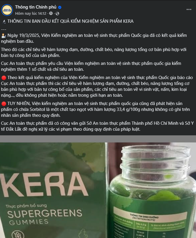 Ngày 19/3/2025, Viện Kiểm nghiệm an toàn vệ sinh thực phẩm Quốc gia đã có kết quả kiểm nghiệm ban đầu.