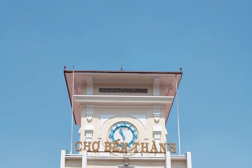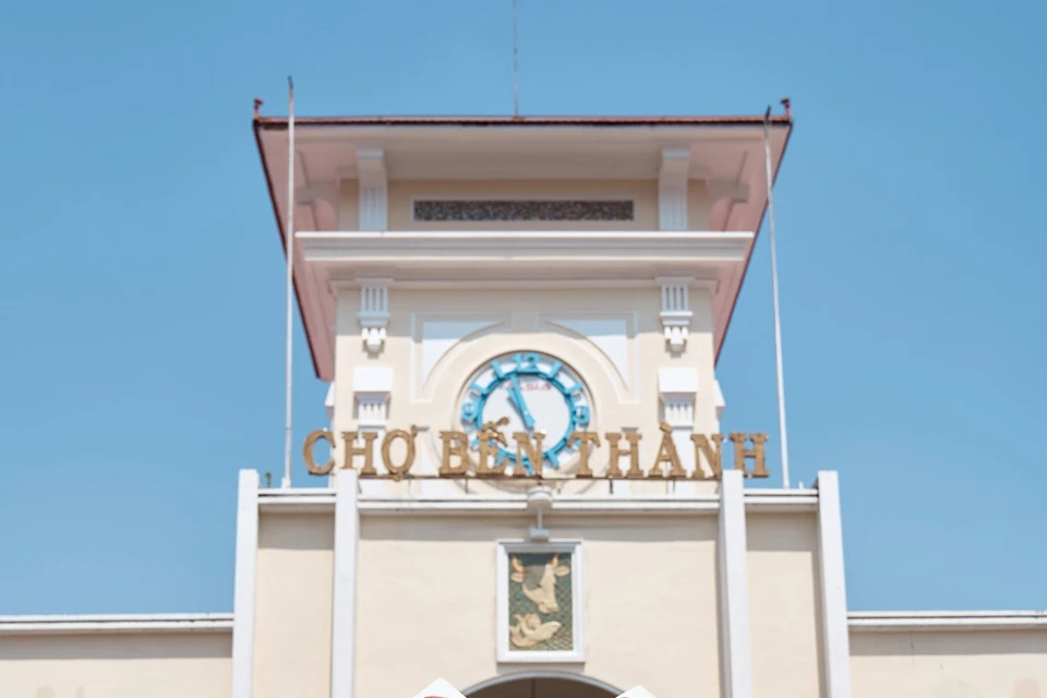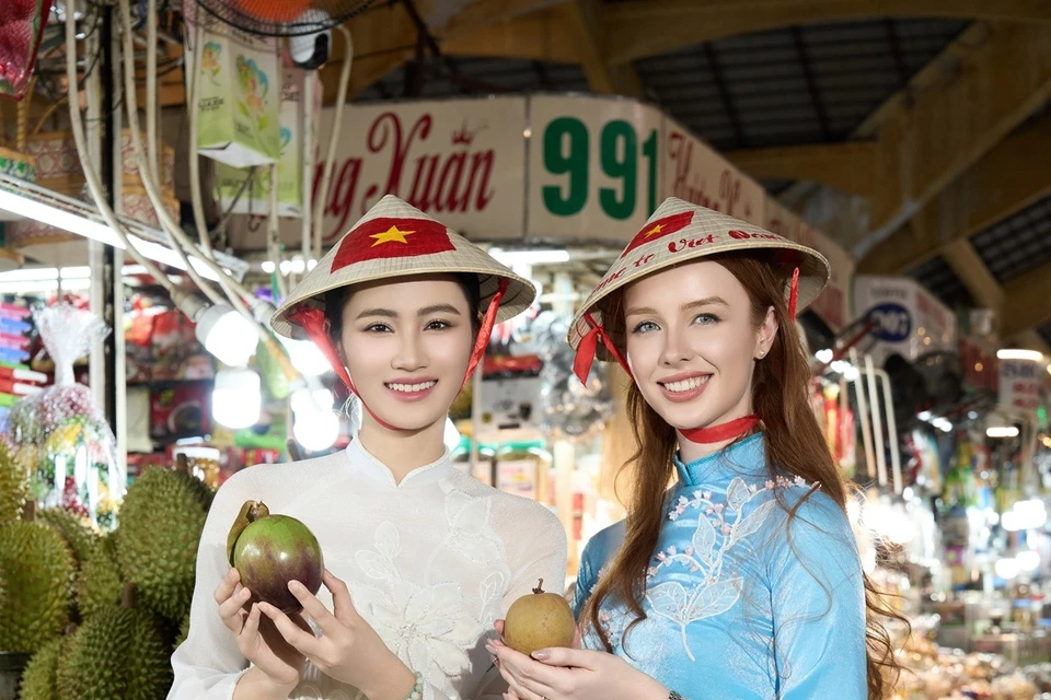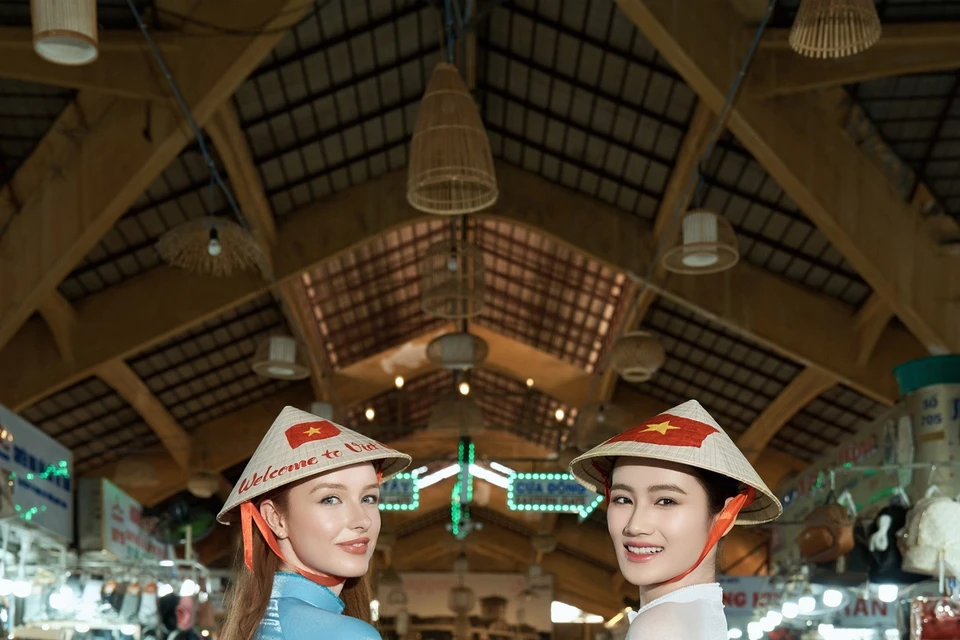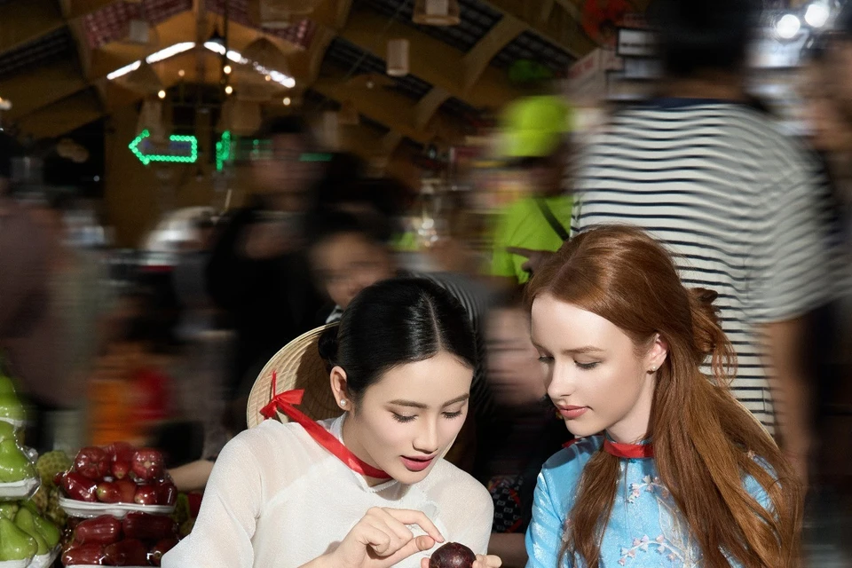 Hai người đẹp cùng biểu tượng Chợ Bến Thành của thành phố Sài Gòn sôi động.