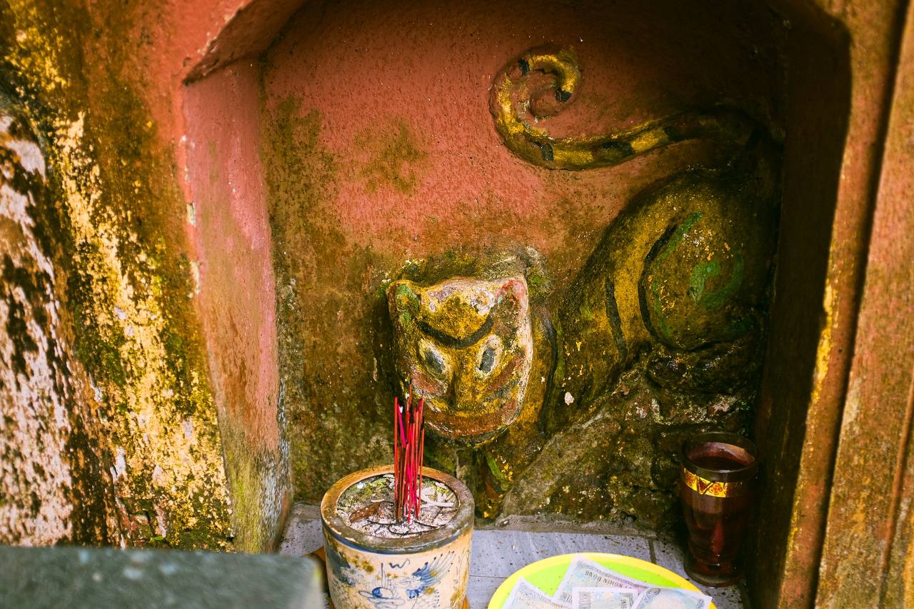 Bước vào sân đền, du khách sẽ được dẫn lối qua bình phong đá, nơi thờ ông Bạch Hổ - một trong những linh vật quan trọng trong tín ngưỡng dân gian. Tòa Đệ Tam với gian giữa thờ các vị quan, gian bên phải thờ Quan Bắc Đẩu cùng kiệu Mẫu, và gian bên trái thờ Quan Nam Tào cùng ban Gia Tiên, tạo nên một không gian trang nghiêm, linh thiêng. Hai bên hành lang là lối đi, dẫn du khách vào sâu hơn trong khuôn viên đền.