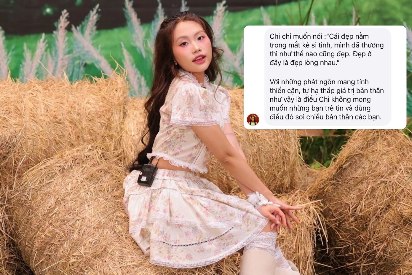 Giọng ca sinh năm 2003 cho rằng việc gán cho nghệ sĩ những lời lẽ mang tính tự ti là hành động thiếu trách nhiệm. Theo cô, quan điểm này vô tình cổ xúy cho suy nghĩ “kém sắc thì không được quyền mơ ước” một cách nhìn nhận méo mó về giá trị con người. Thay vào đó, Phương Mỹ Chi nhấn mạnh: “Cái đẹp nằm trong mắt kẻ si tình. Quan trọng hơn hết là cách ta đối xử và trân trọng nhau. Đẹp là đẹp lòng nhau”.