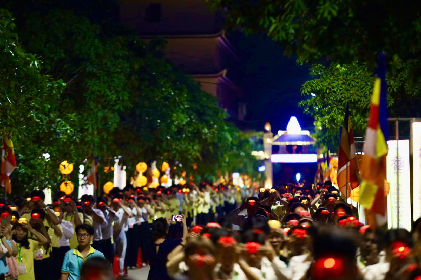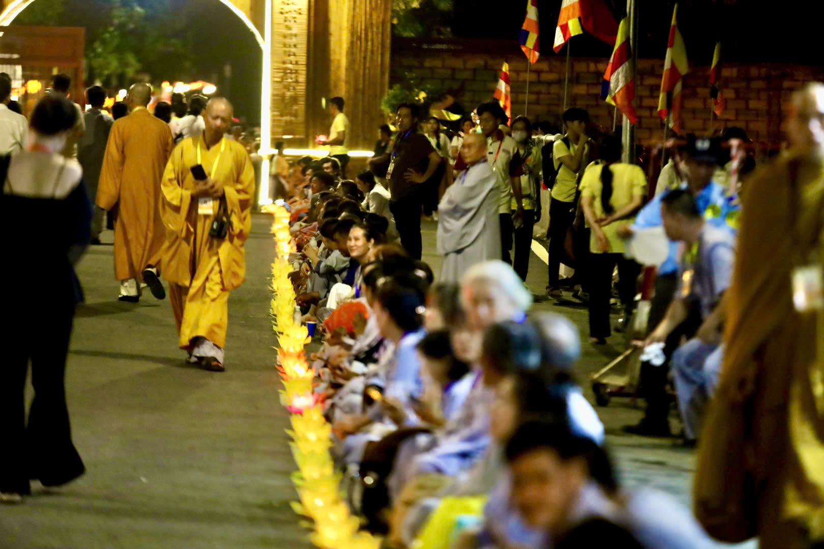 Hàng ngàn Phật tử xếp thành những hàng dài, trang nghiêm chờ thả hoa đăng