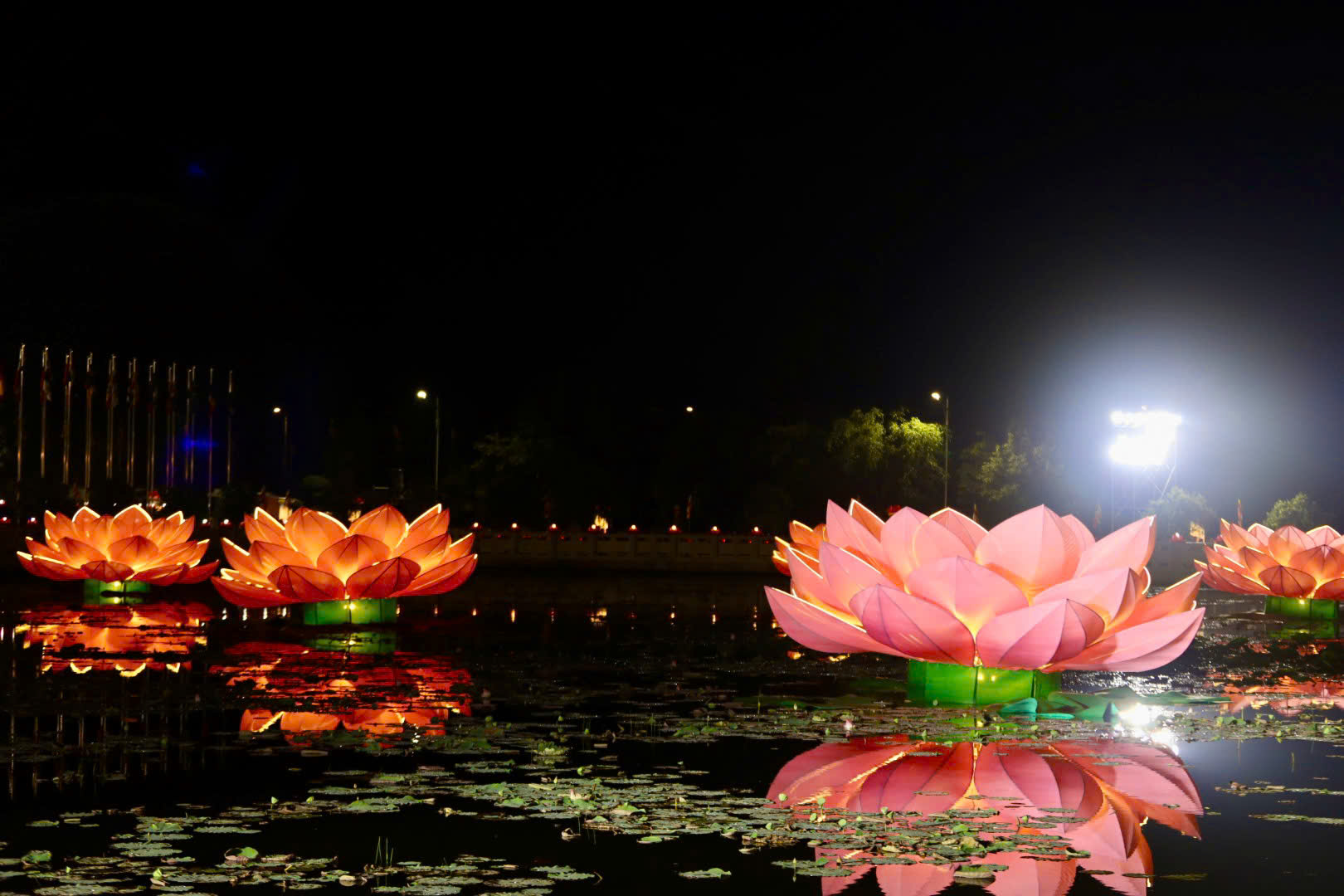 Theo ban tổ chức, hoa đăng gồm 20.000 chiếc bằng giấy đốt nến, 10.000 chiếc chạy pin để phòng khi trời mưa và 5.000 chiếc bằng nhựa được đặt xung quanh hồ. Các hoa đăng giấy và chạy pin được thả nhẹ nhàng xuống mặt nước, cùng với 7 đóa sen lớn trang trí giữa hồ, kết thành “biển ánh sáng” thiêng liêng và xúc động.