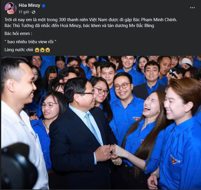 Hòa Minzy chia sẻ trên trang cá nhân khoảnh khắc cô được bắt tay Thủ tướng bên lề buổi đối thoại. Giọng ca quê Bắc Ninh bày tỏ niềm vui và xúc động khi nhận được lời khen từ Thủ tướng. "Trời ơi nay em là một trong 300 thanh niên Việt Nam được đi gặp Bác Phạm Minh Chính. Bác Thủ Tướng đã nhắc đến Hoà Minzy, bác khen và tán dương Mv Bắc Bling", cô chia sẻ.